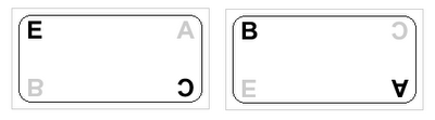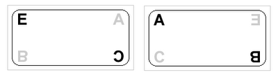 Now, to obtain the product of any element X from the group with B, we just read from the result card the element from the position corresponding to the position of X in the witness card. For example, to see the result of the operation C·B, we look for the element C in the witness card. It is in the lower right corner. We look in the same position in the result card. The corresponding element is A. We can check in the multiplicative table that indeed C·B = A.
