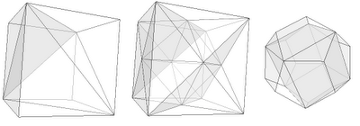 The cube can be inscribed in this way in the octahedron, but also reciprocally. The same reciprocity holds between the icosahedron and the dodecahedron. Such polyhedra are said to be dual. The tetrahedron is self-dual.