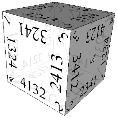 The reader is invited to study the symmetries of the permutations written on the cube.